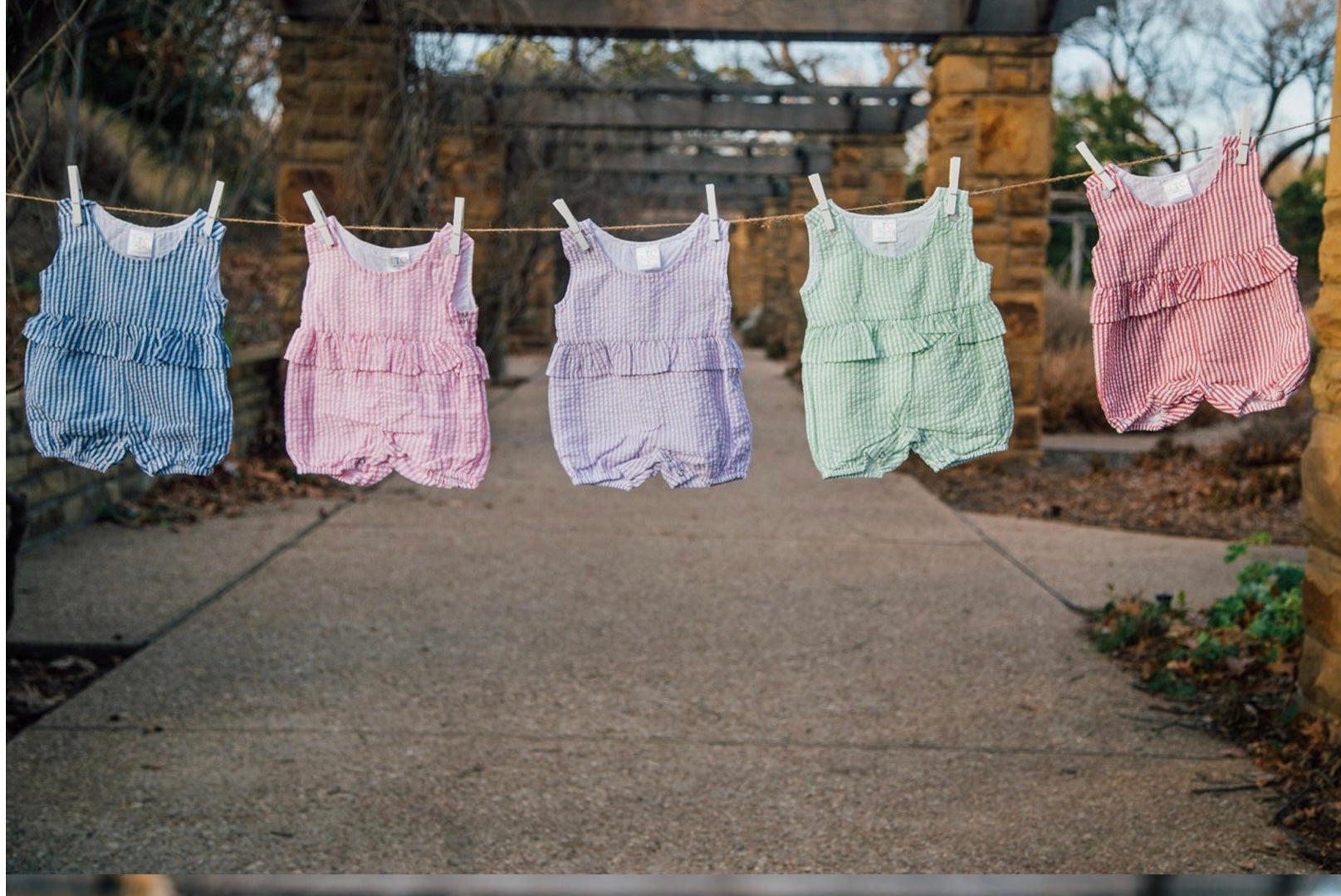 Get ready for warmer days with our girls seersucker romper. Made from 100% cotton, this romper is both stylish and comfortable. It features a ruffle detail and is available in a variety of colors. The romper is fully lined and has a convenient snap closure at the crotch for easy diaper changes. The single button on the straps adds a cute and functional.